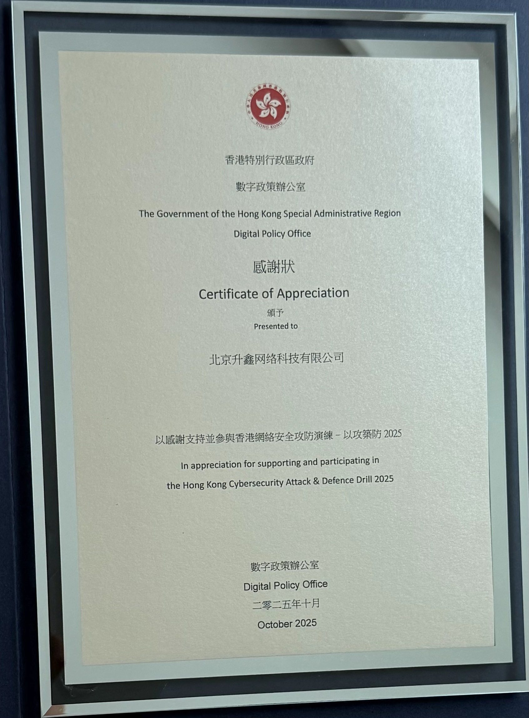 今年的演练汇聚了来自香港及内地的顶尖网络安全团队,在“实兵、实网、实战”的真实环境下检验防御能力。青藤云安全作为本次演练的红队成员及蓝队技术顾问单位,凭借在攻防两端的卓越表现,荣获香港特别行政区政府数字政策办公室颁发的感谢状,以表彰其在提升本地网络防御水平方面的突出贡献。